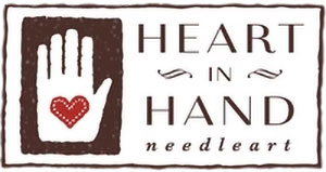 Scheda diagramma punto croce (in bianco e nero) del designer Heart in hand, contenente un sacchetto di perline.